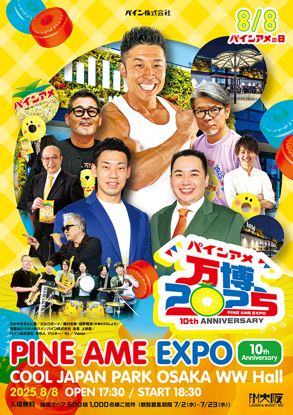 パイン株式会社(本社:大阪市天王寺区、代表取締役社長:上田真弘)は、2025年8月8日(金)に大阪市中央区の「COOL JAPAN PARK OSAKA WWホール」にて、イベント「パインアメ万博2025」を開催します。