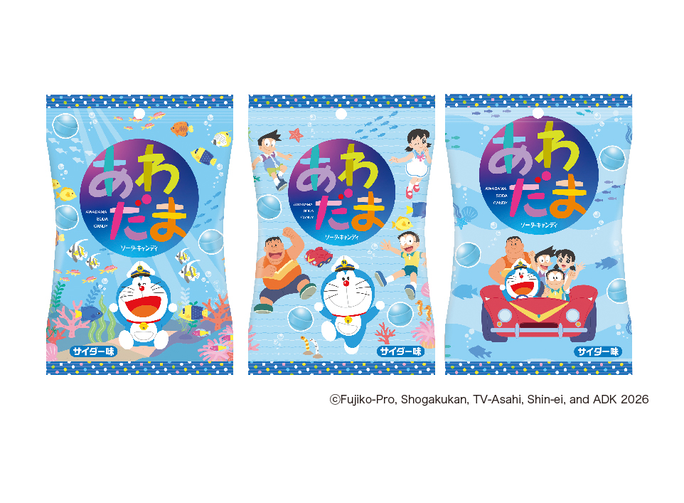 ソーダキャンディのパイオニアとして39年間製造を続けている「あわだま」。2026年2月27日(金)に公開の『映画ドラえもん 新・のび太の海底鬼岩城』の公開を記念して、映画の世界観をパッケージにデザインした「ドラえもん あわだま」を数量限定で発売いたします。